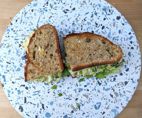 I absolutely love a good egg mayo sarnie but always held off from making my own as I assumed i'd be horrified once I knew the actual amount of mayo which goes in. But, if you're as clueless as I was fear not! The yolks of the eggs is what makes this so creamy and you only need a fraction of the mayo that you think you do. The end result is rich and creamy (and not too pongy I promise!) Peeling and mashing the eggs is also weirdly satisfying (don't judge me...) and something I think mini sticky jam hands everywhere can get involved in.